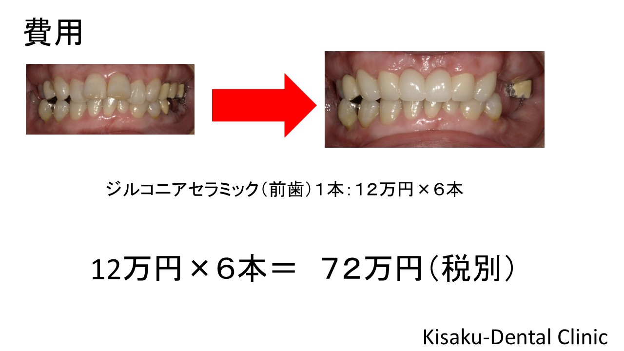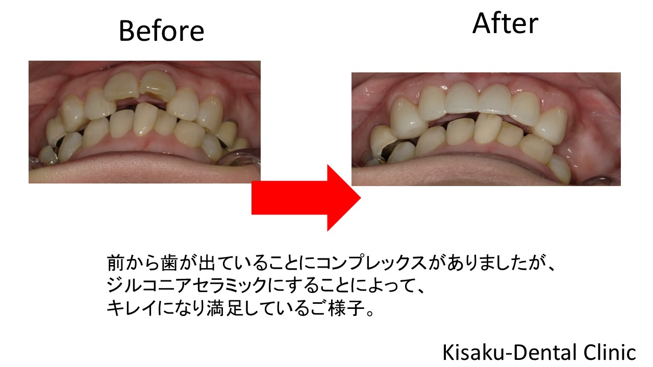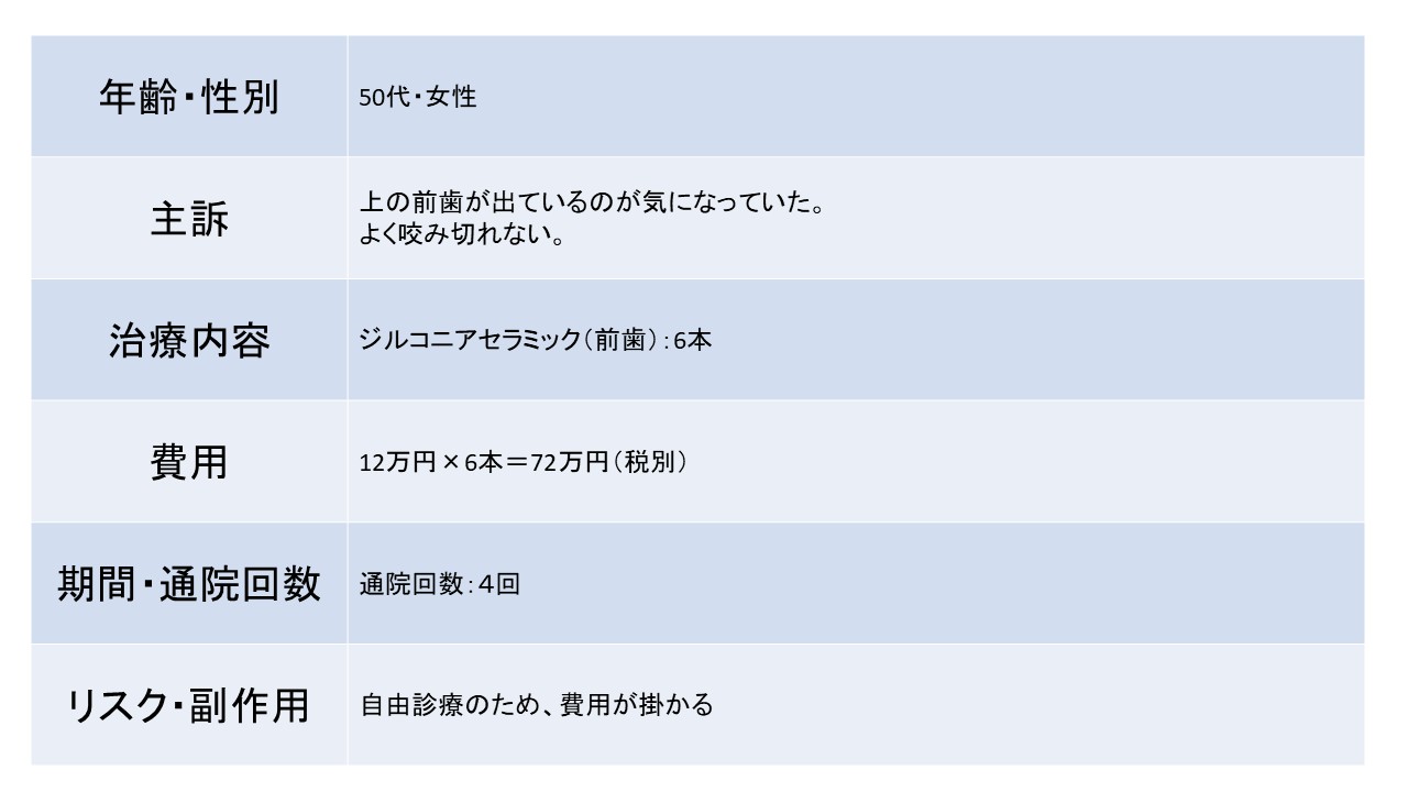 上の前歯が出ているのが気になっていた。よく咬み切れない。 50代 女性ージルコニアセラミックー