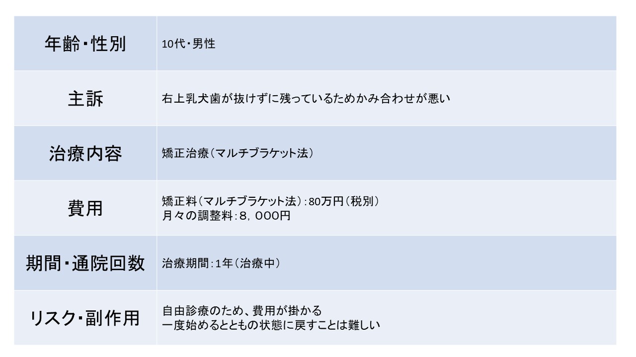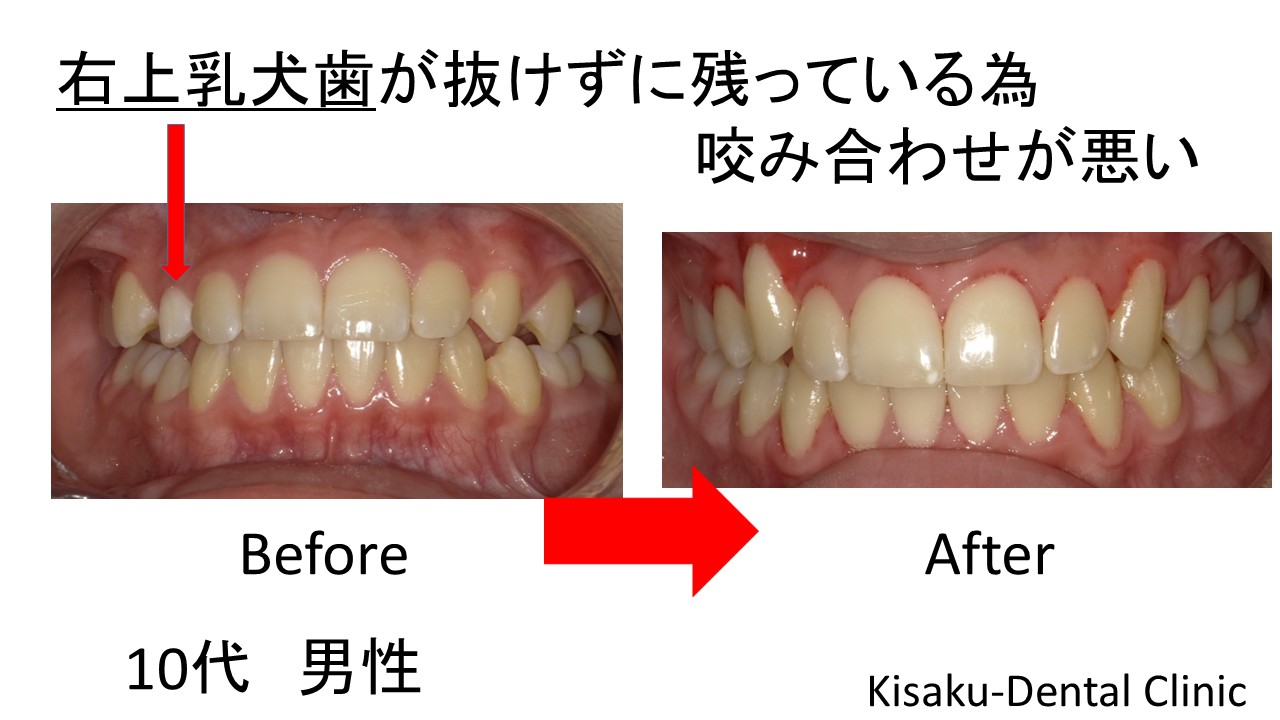 右上乳犬歯が抜けずに残っているため 咬み合わせが悪いー10代 男性ー矯正(マルチブラケット法)