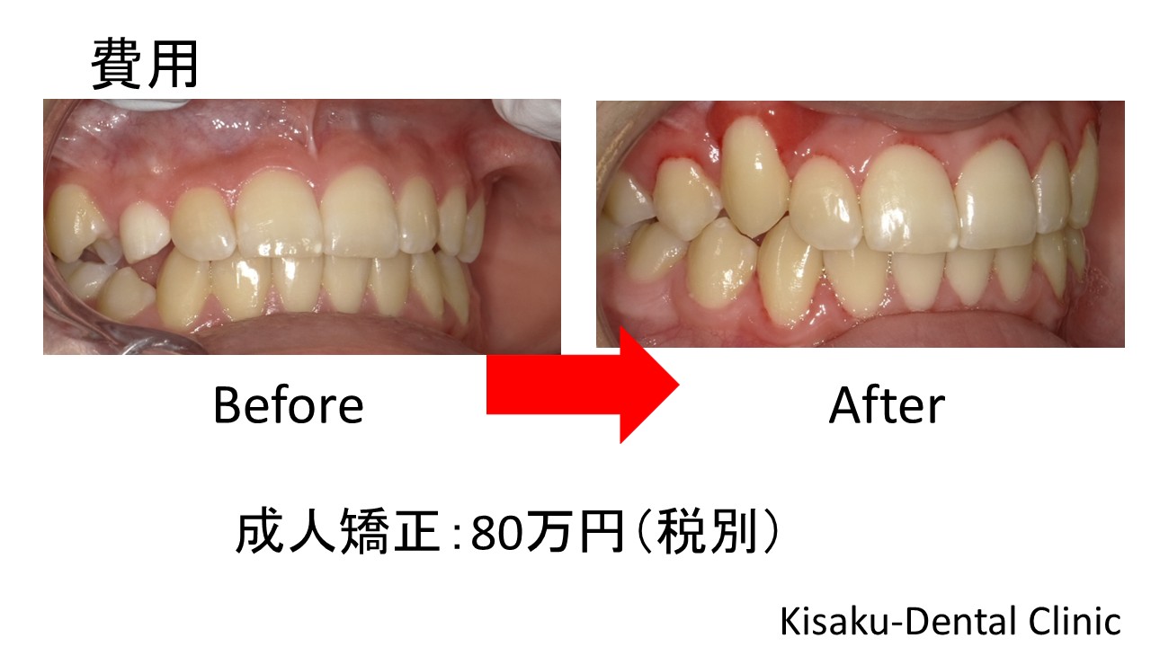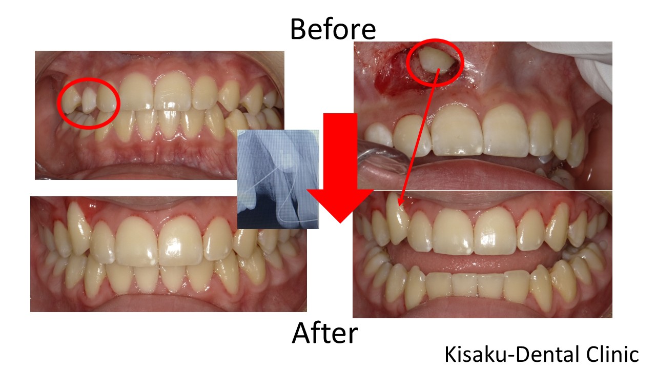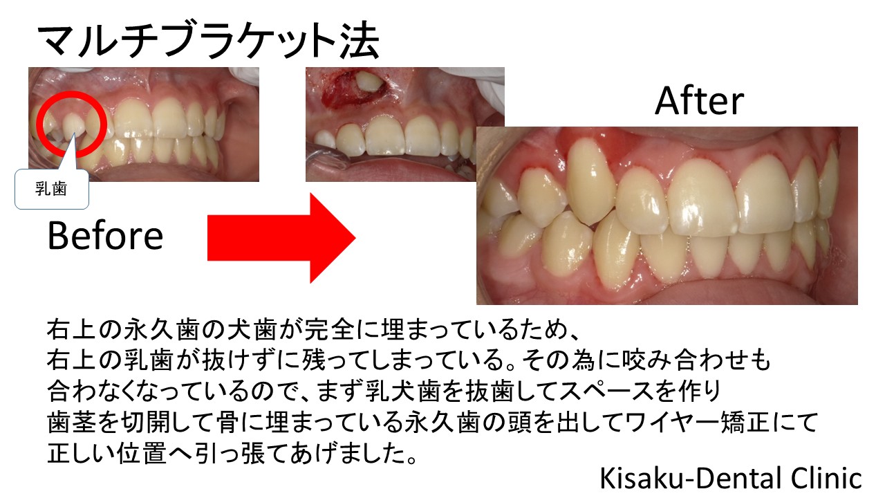 骨に埋まっている永久歯の頭を出してあげて、ワイヤー矯正にて正しい位置へ引っ張てあげました。