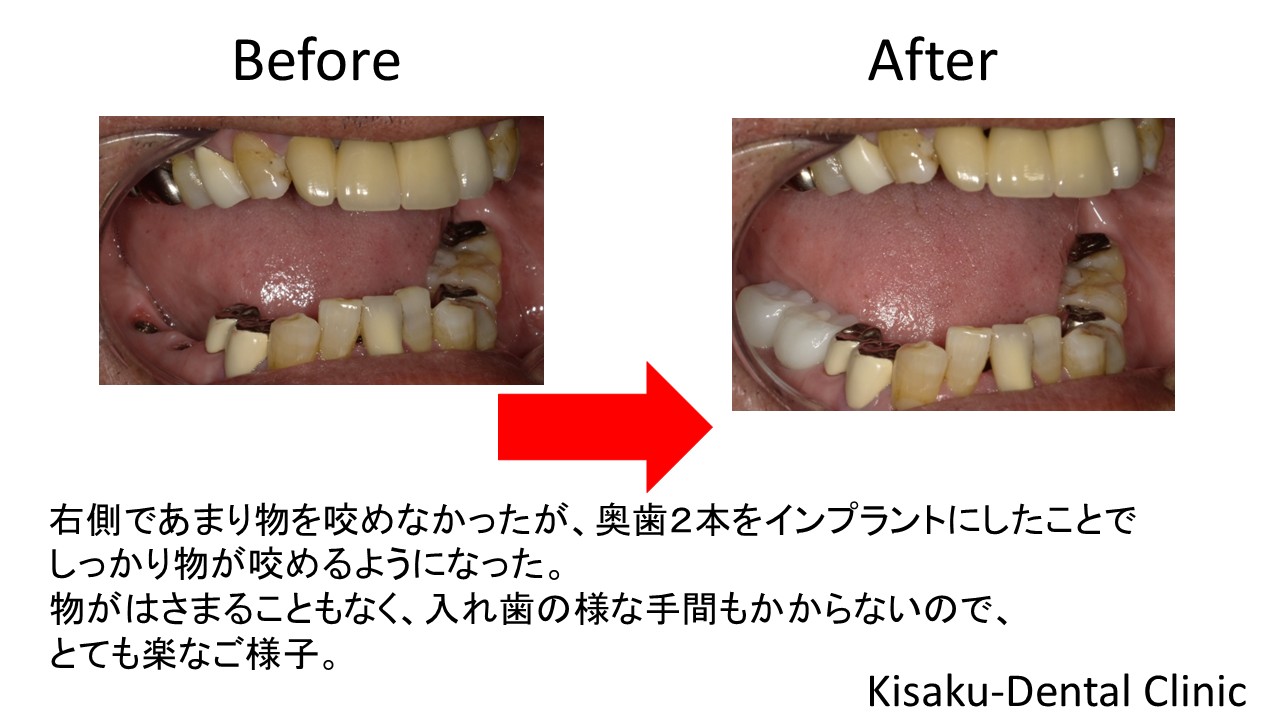 奥歯2本をインプラントにしたことで、しっかり物が咬めるようになった。