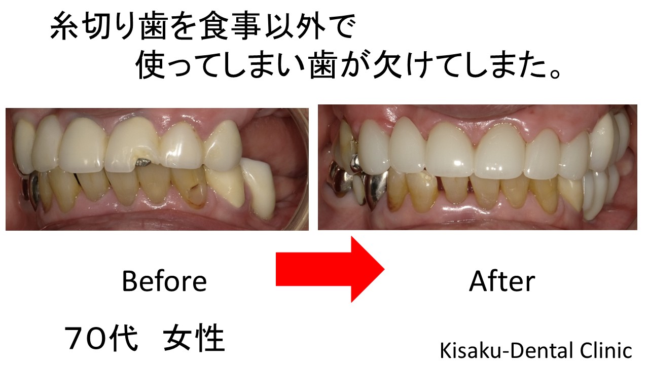 糸切り歯を食事以外で使ってしまい、欠けてしまった。入れ歯は使いたくない。