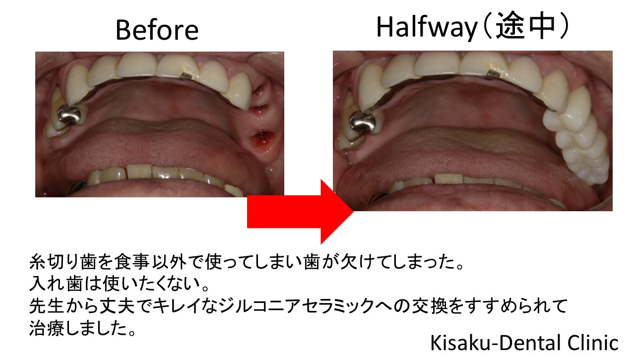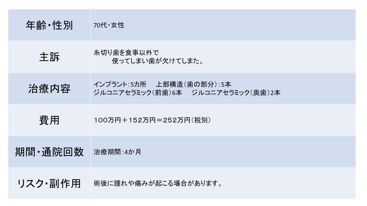 糸切り歯を食事以外で使ってしまい歯がかけてしまった。ー70代 女性ーインプラント・ジルコニアセラミック