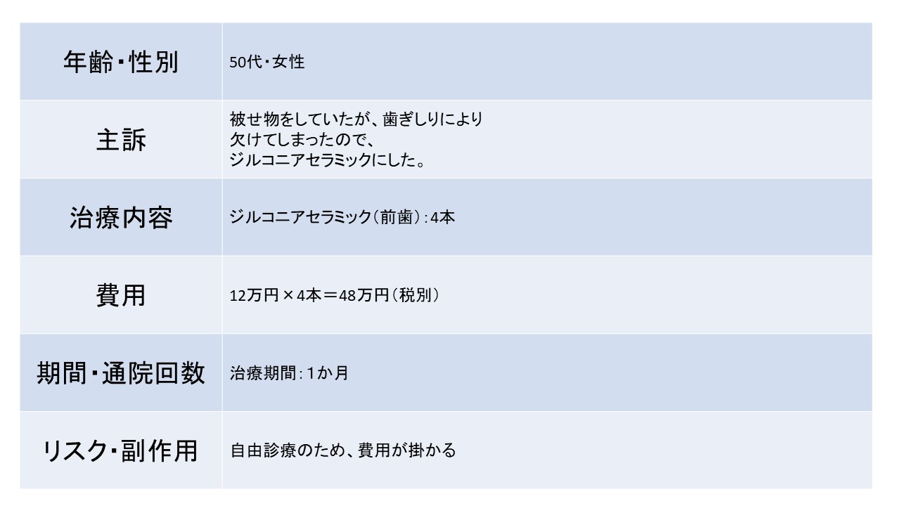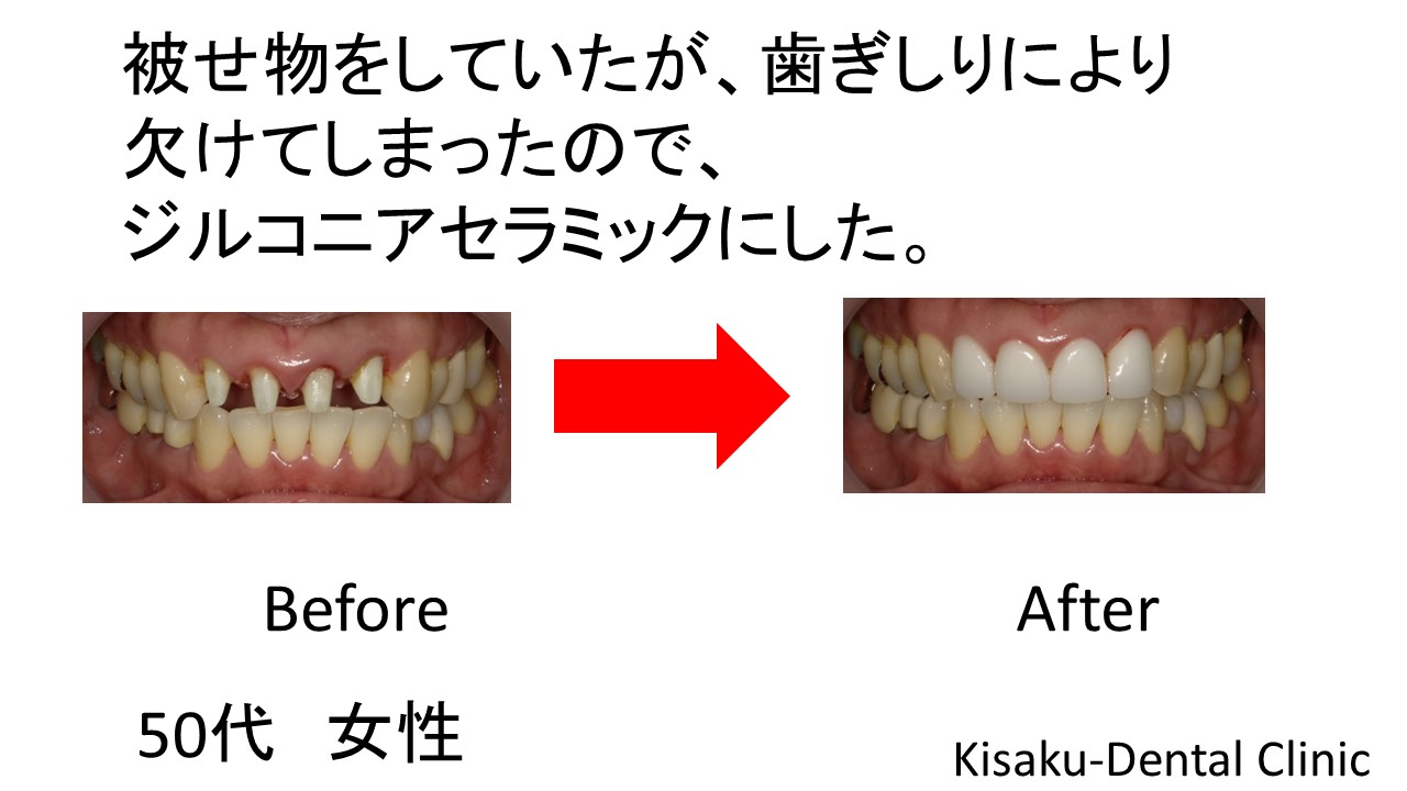 被せ物をしていたが、歯ぎしりにより欠けてしまったので、ジルコニアセラミックにした。 50代 女性ージルコニアセラミックー