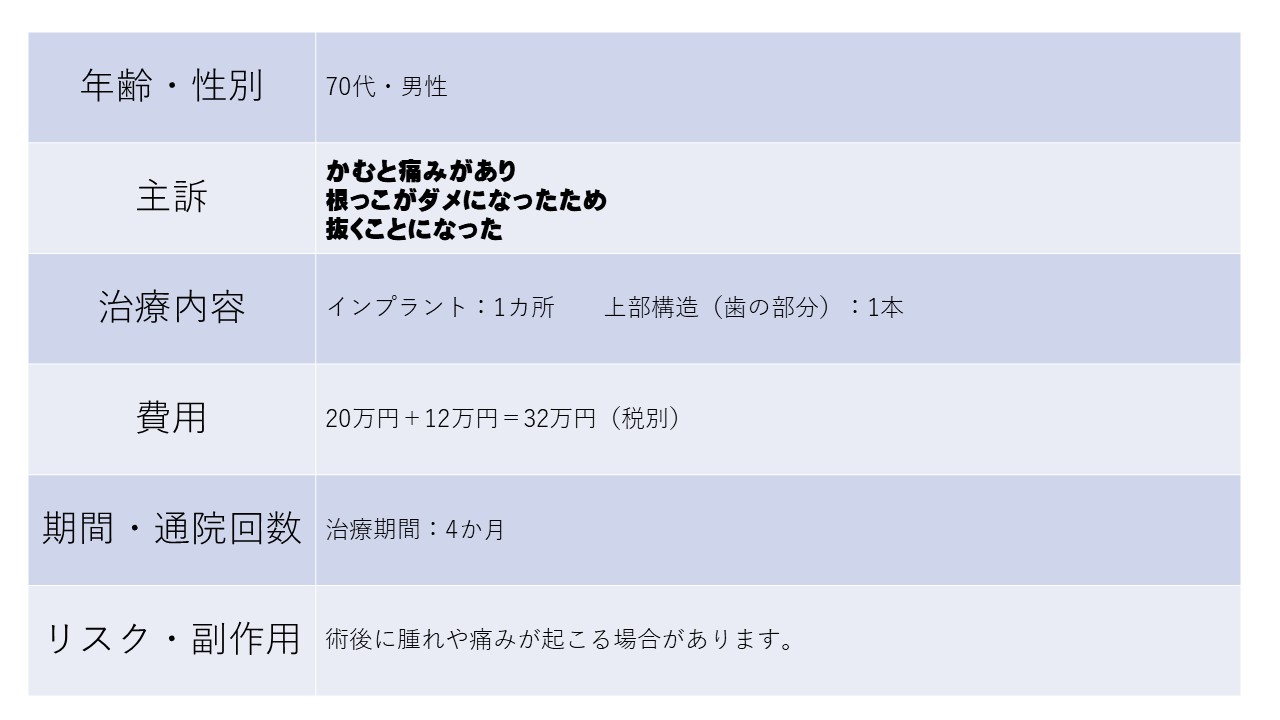 かむと痛みがあり根っこがダメになったため抜くことになった 70代 男性ーインプラントー
