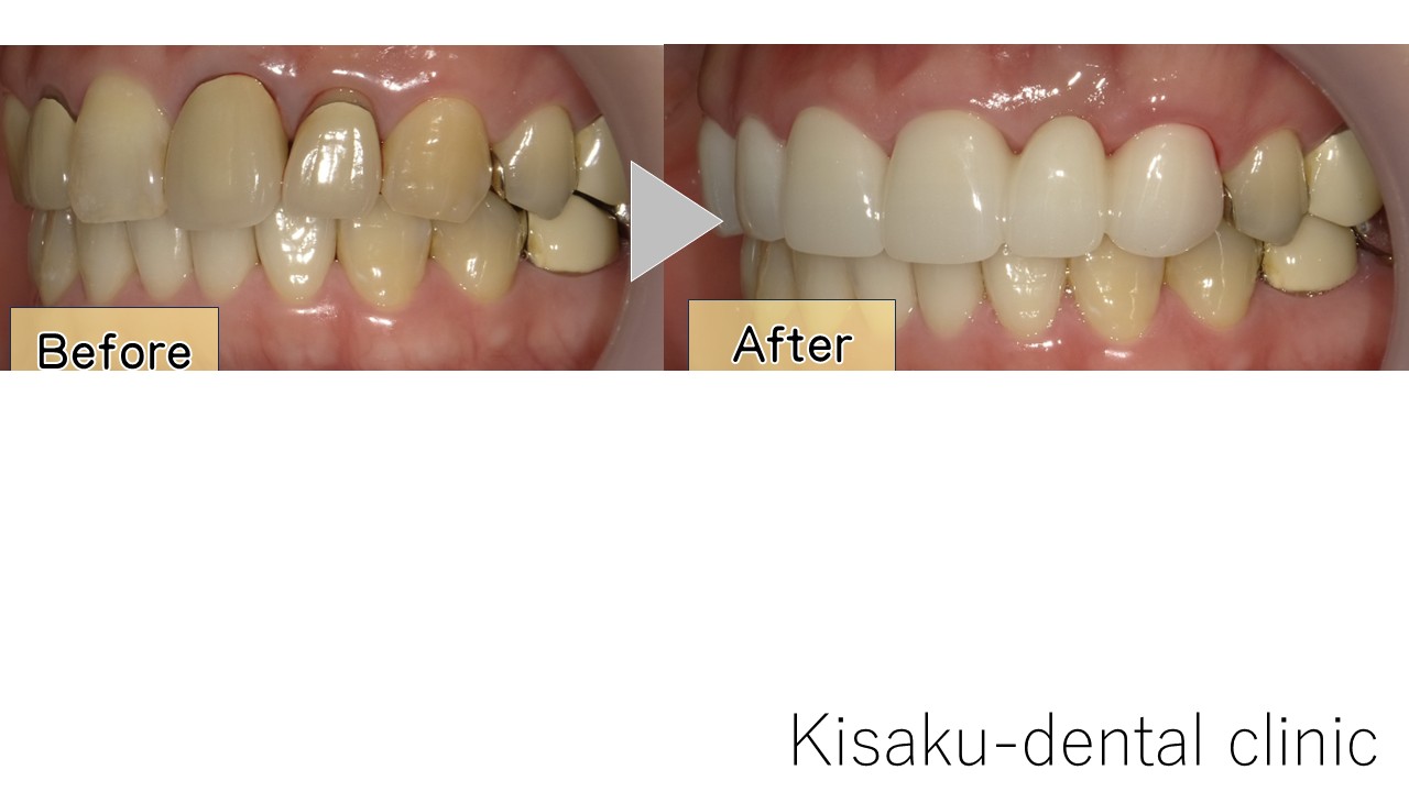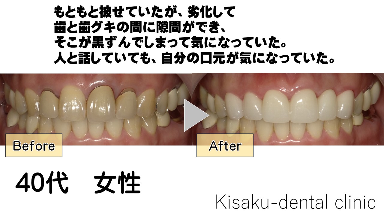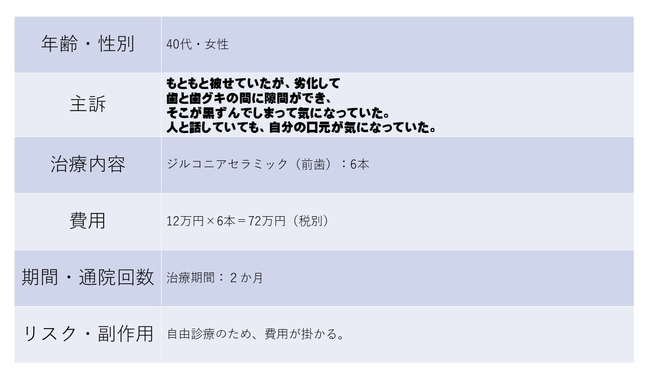 もともと被せていたが、劣化して 歯と歯グキの間に隙間ができ、 そこが黒ずんでしまって気になっていた。 人と話していても、自分の口元が気になっていた。 40代 女性ージルコニアセラミックー
