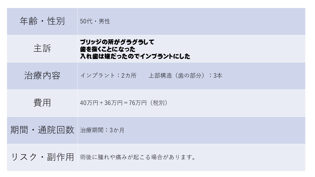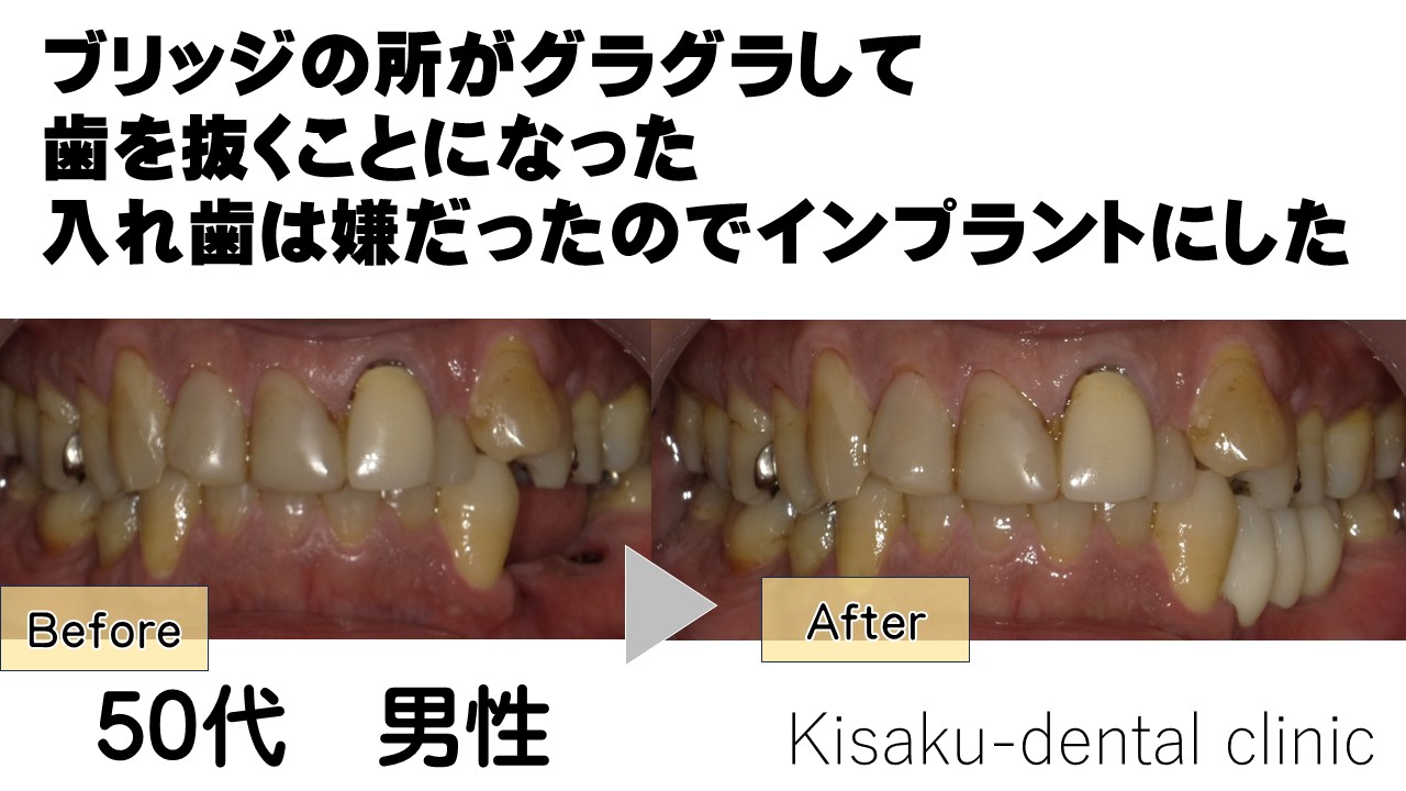 ブリッジの所がグラグラして 歯を抜くことになった 入れ歯は嫌だったのでインプラントにした 50代 男性ーインプラントー
