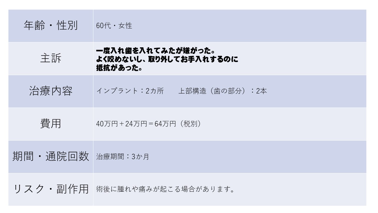 一度入れ歯を入れてみたが嫌がった。 よく咬めないし、取り外してお手入れするのに 抵抗があった。 60代 女性ーインプラントー