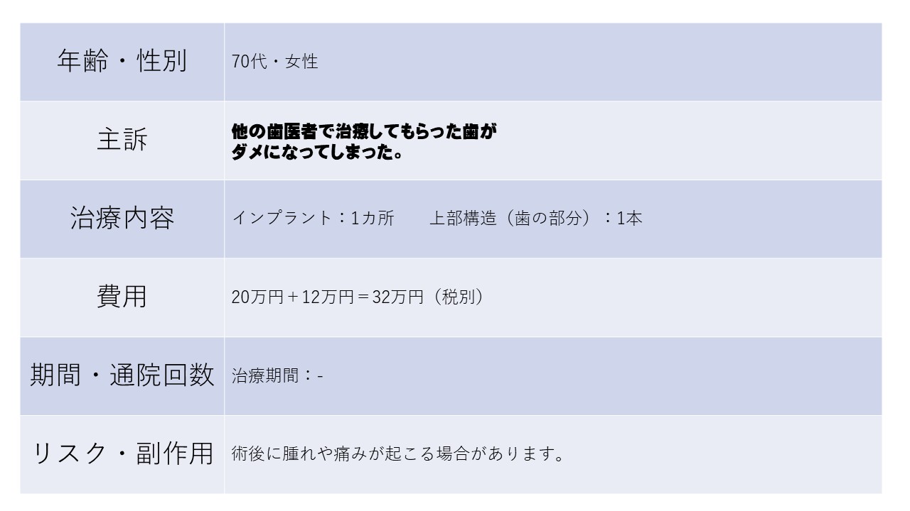 他の歯医者で治療してもらった歯が ダメになってしまった。 70代 女性ーインプラントー 70代 女性ーインプラントー