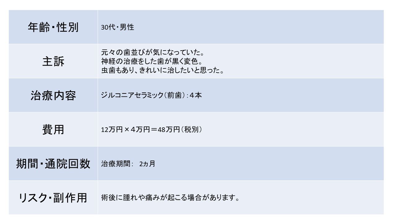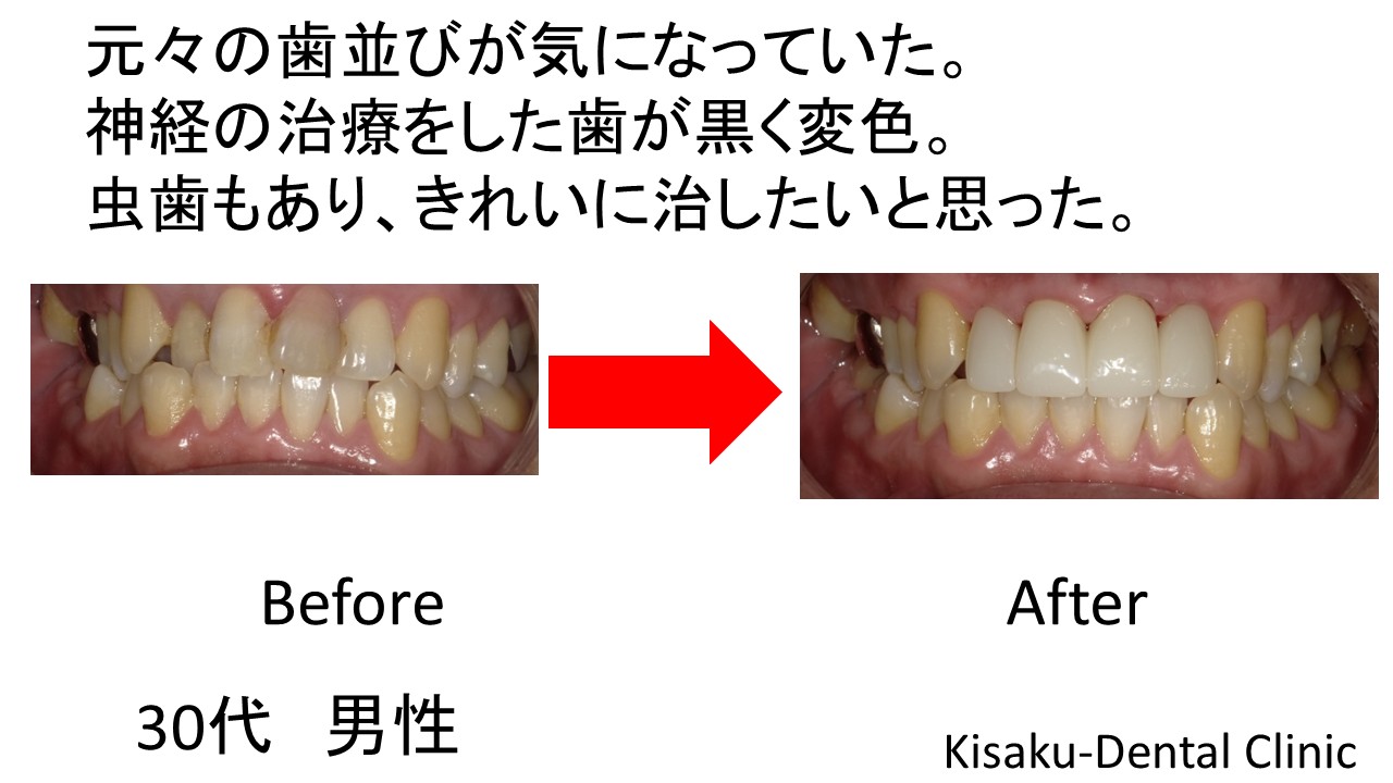 元々の歯並びが気になっていた。神経の治療をした歯が黒く変色。虫歯もあり、きれいに治したいと思った。 30代 男性ージルコニアセラミックー