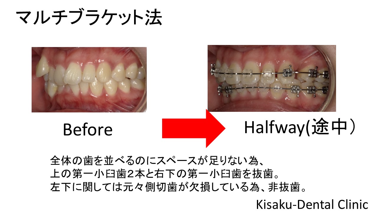 上の第一小臼歯2本と右下の第一小臼歯を抜歯。 左下に関しては元々側切歯が欠損している為、非抜歯。