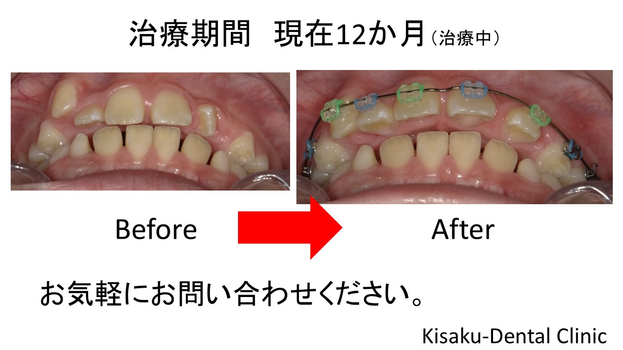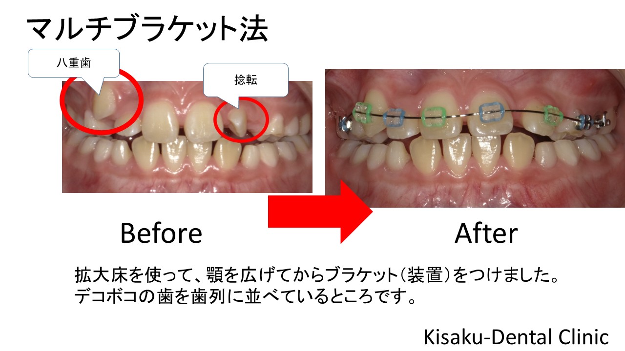 拡大床を使って顎を広げてからブラケット(矯正装置)をつけました。