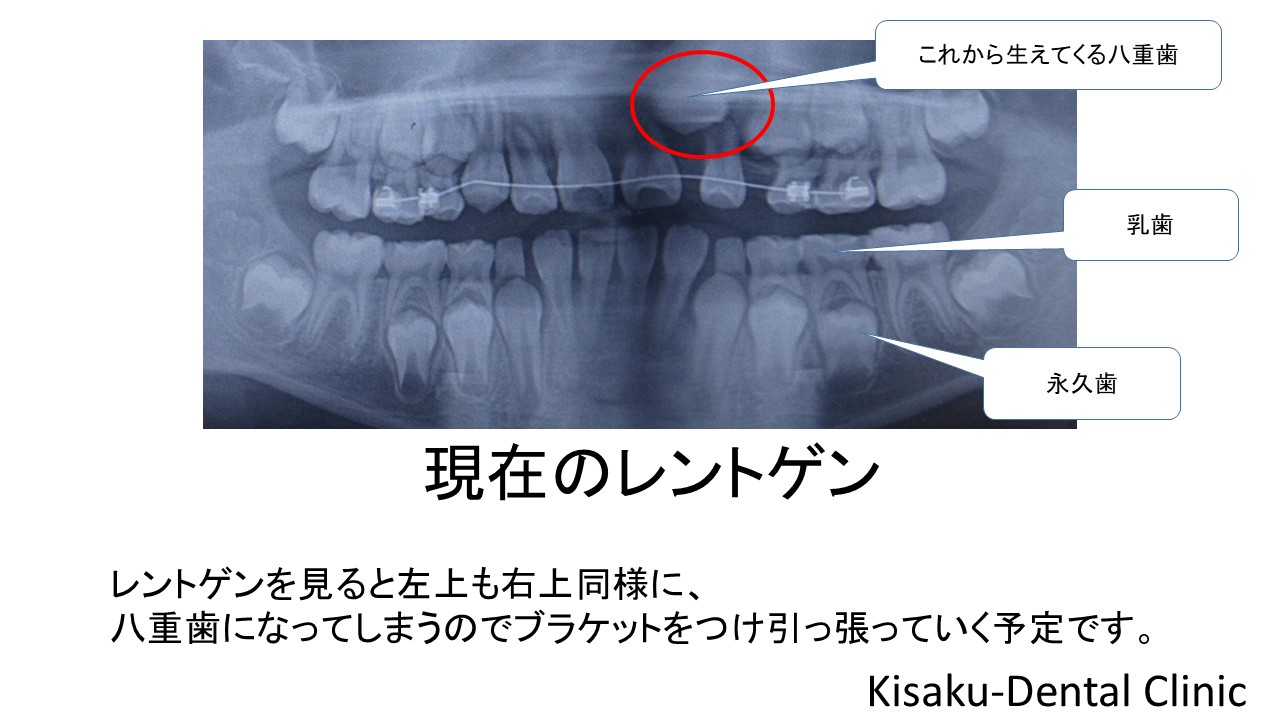 レントゲンを見ると左上も、右上同様八重歯になってしまうので、ブラケットをつけワイヤー矯正で引っ張っていく予定です。