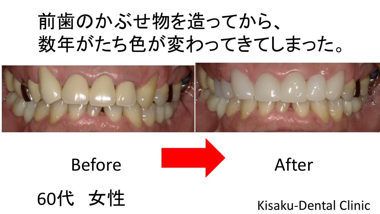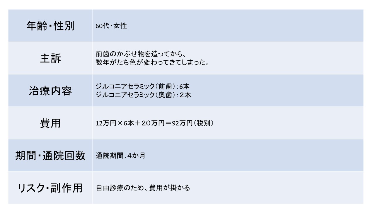 前歯のかぶせ物を造ってから、数年がたち色が変わってきてしまった。ー60代 女性ー ジルコニアセラミック