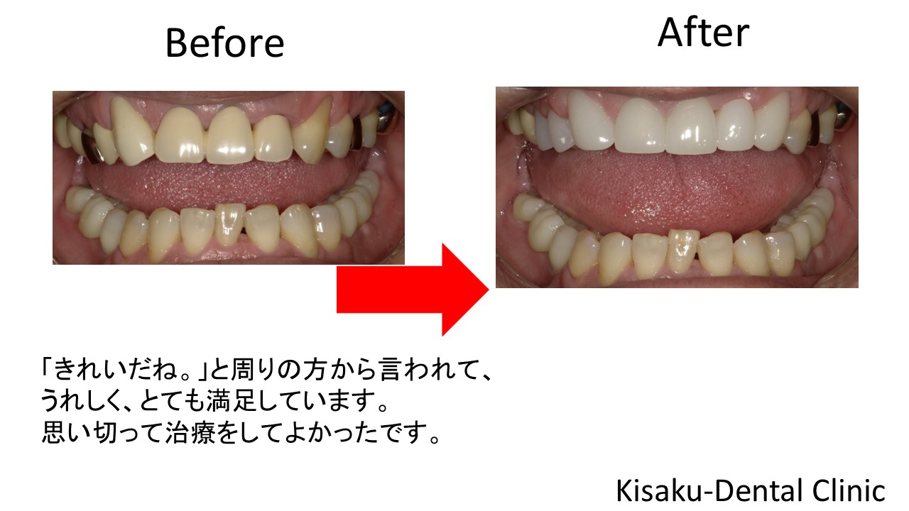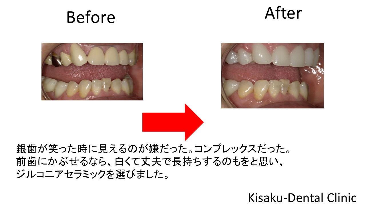 前歯のかぶせ物を造ってから、数年がたち色が変わってきてしまった。また、銀歯が笑った時に見えるのが嫌だった。