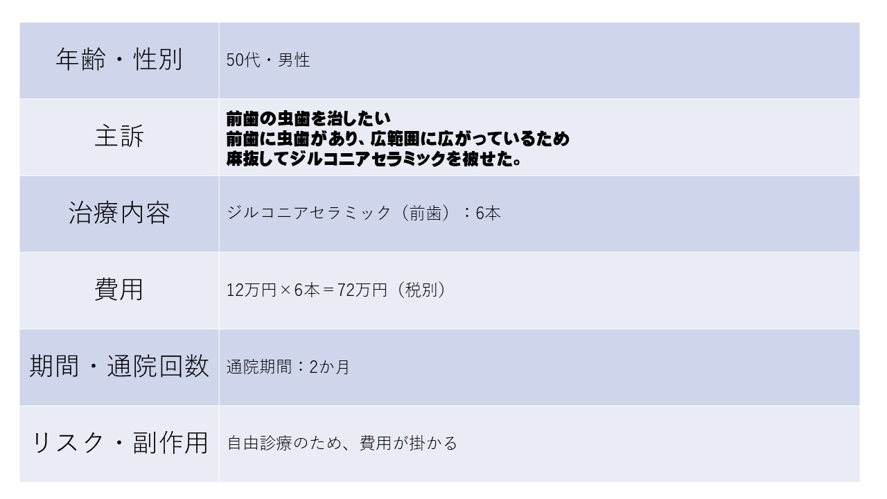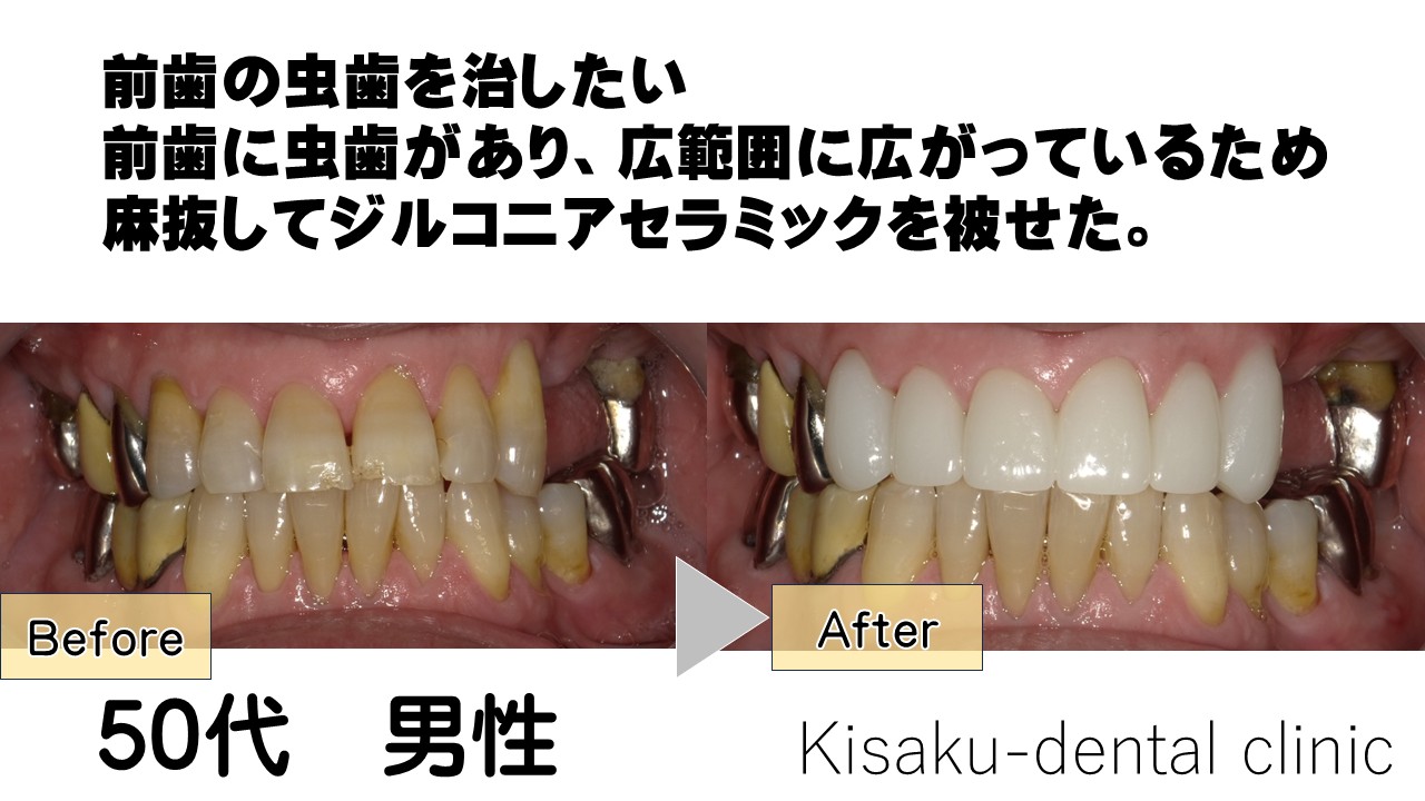 前歯の虫歯を治したい 前歯に虫歯があり、広範囲に広がっているため 麻抜してジルコニアセラミックを被せた。 50代 男性ージルコニアセラミックー