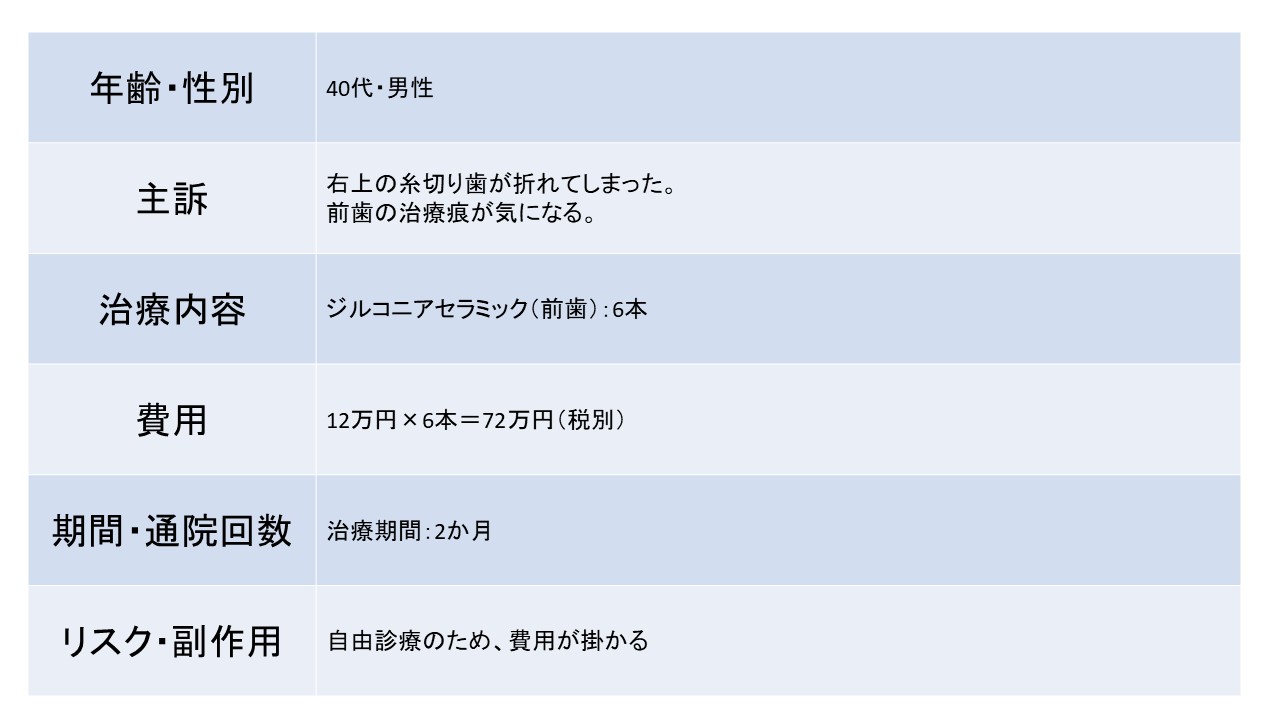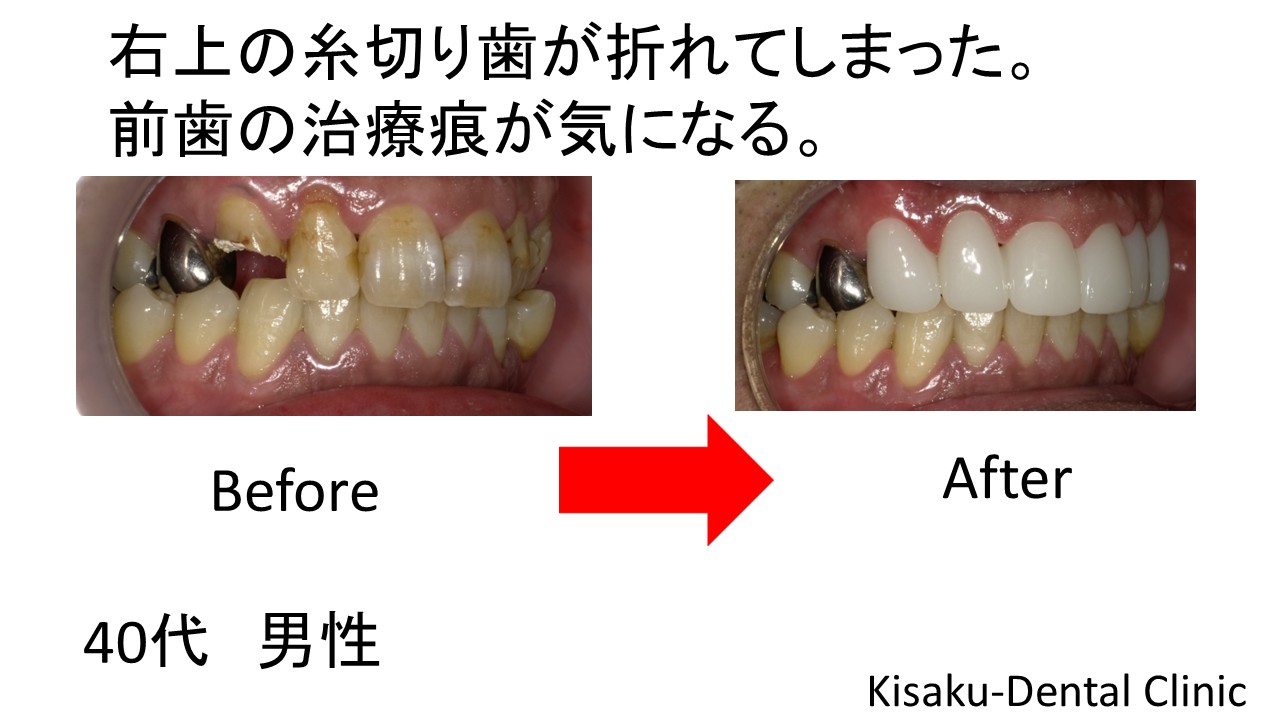 右上の糸切り歯が折れてしまった 前歯の治療痕が気になる 40代 男性ーインプラントー