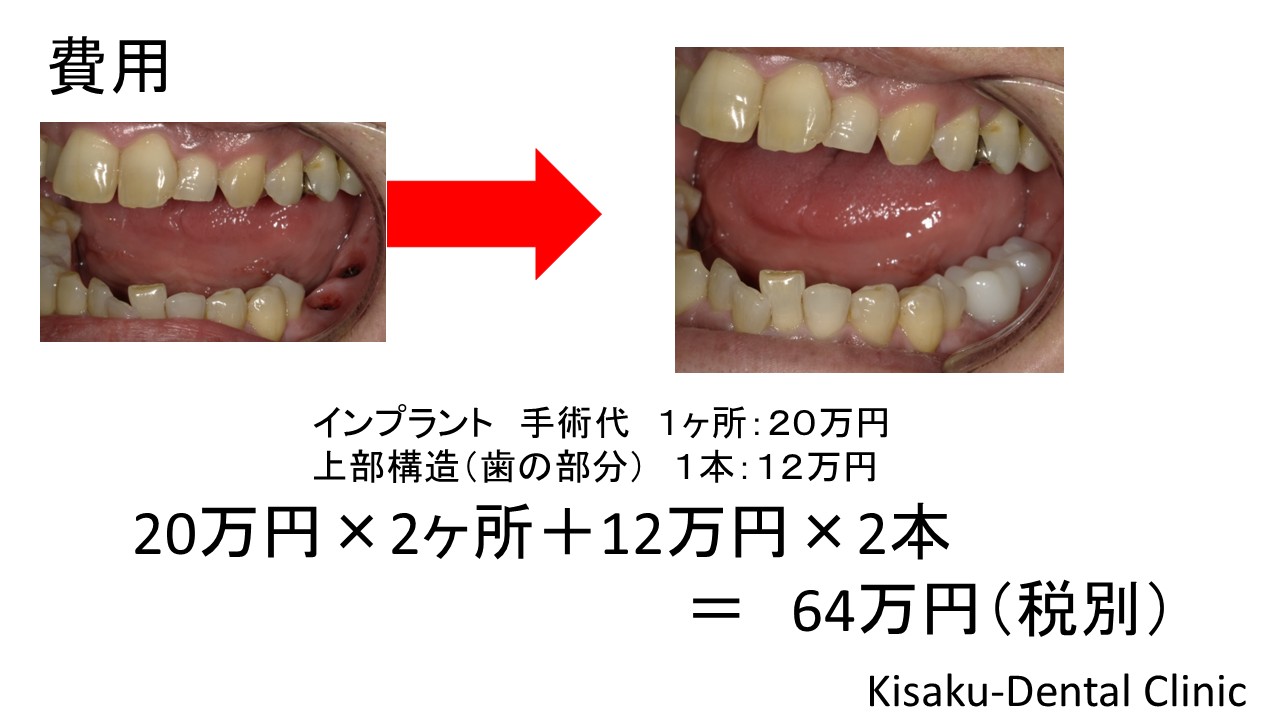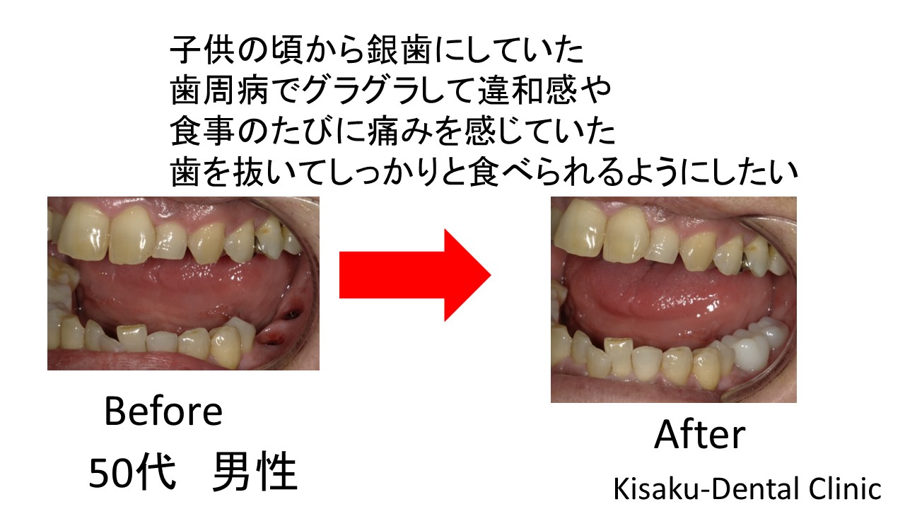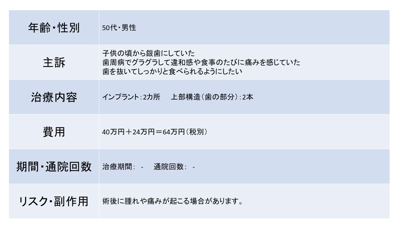 子供の頃から銀歯にしていた 歯周病でグラグラして違和感や 食事のたびに痛みを感じていた 歯を抜いてしっかりと食べられるようにしたい 50代 男性ーインプラントー