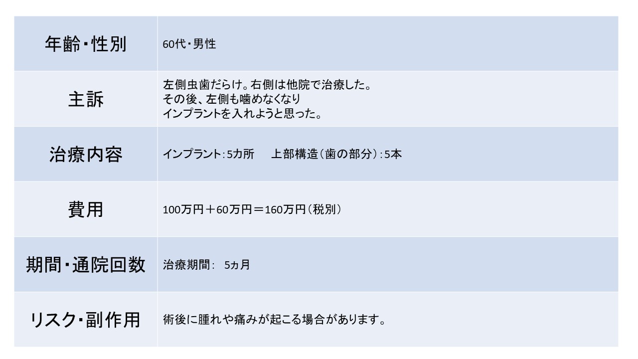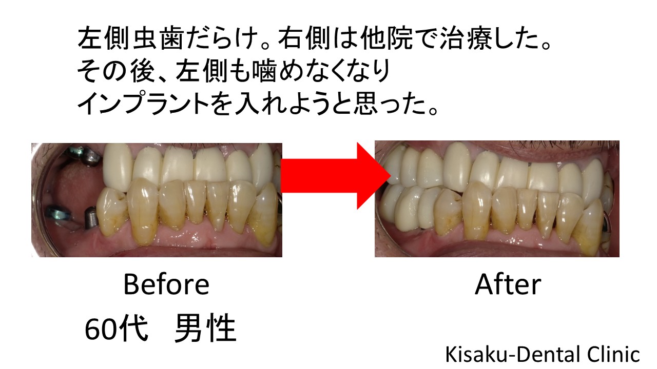 左側虫歯だらけ。右側は他院で治療した。その後、左側も噛めなくなり、インプラントを入れようと思った。 60代 男性-インプラントー