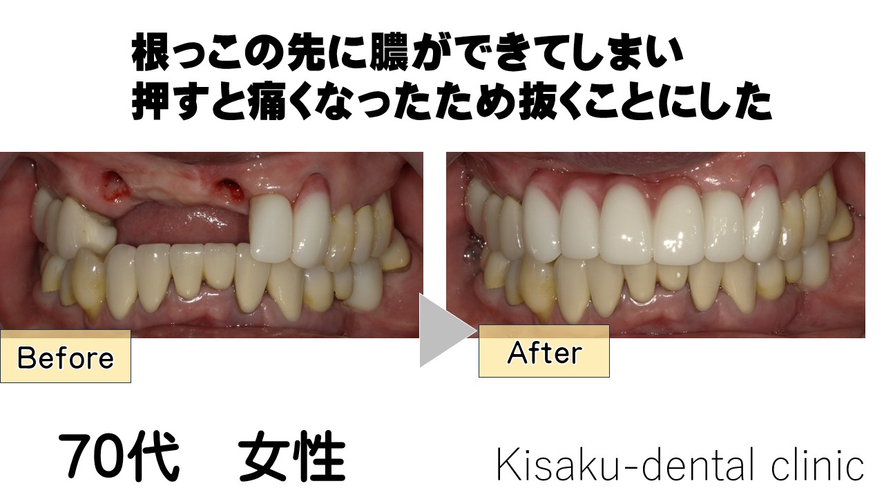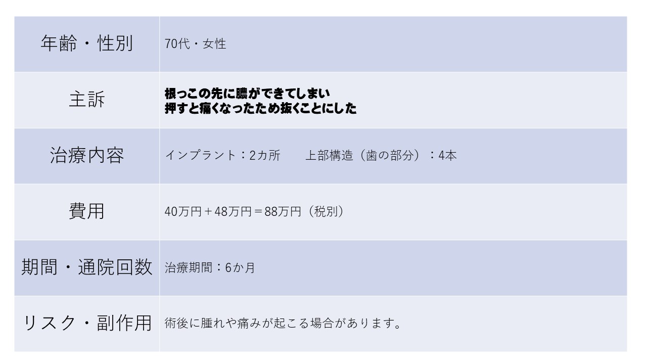 根っこの先に膿ができてしまい 押すと痛くなったため抜くことにした 70代 女性ーインプラントー