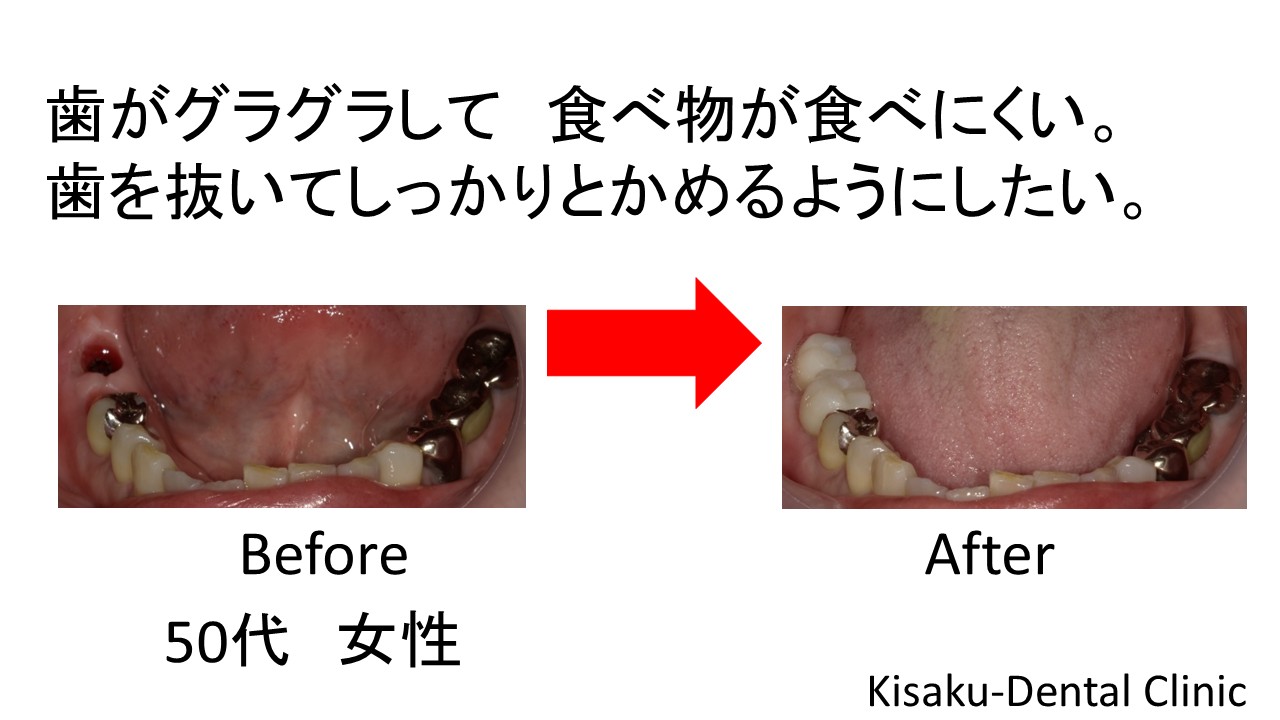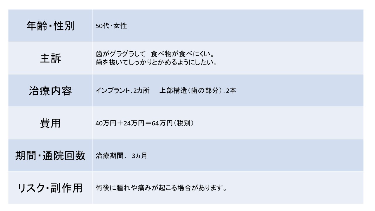 歯がグラグラして 食べ物が食べにくい。歯を抜いてしっかりとかめるようにしたい。 50代 女性ーインプラントー