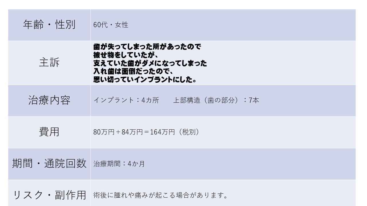 歯が失ってしまった所があったので 被せ物をしていたが、 支えていた歯がダメになってしまった 入れ歯は面倒だったので、 思い切っていインプラントにした。             60代 女性ーインプラントー