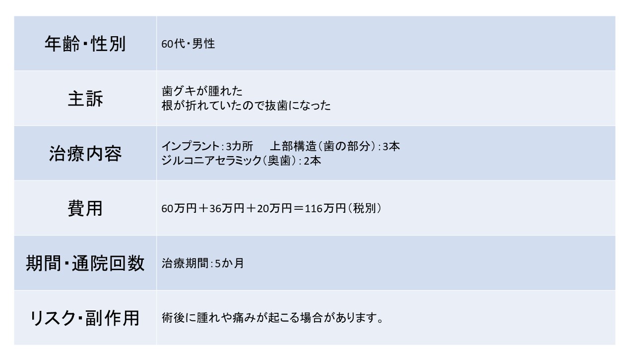 歯グキが腫れた 根が折れていたので抜歯になった 60代 男性ーインプラントー