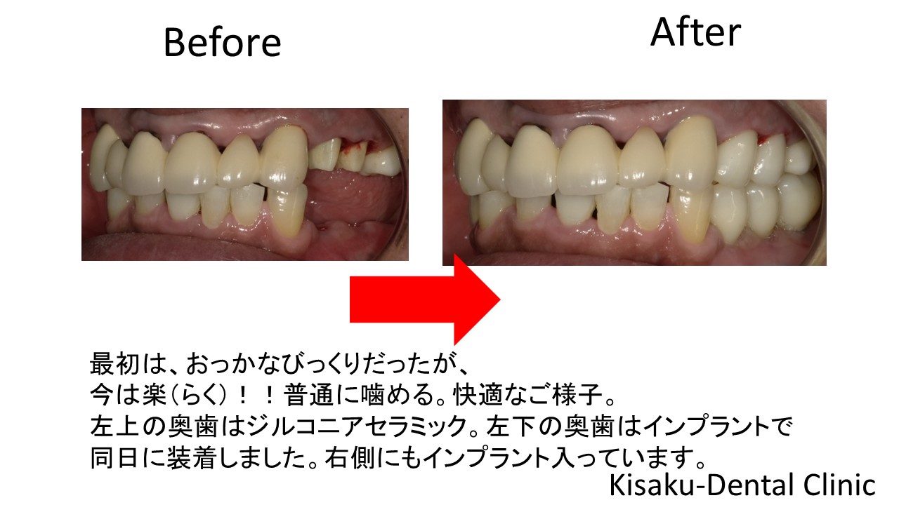 左上の奥歯はジルコニアセラミック。左下の奥歯はインプラントで