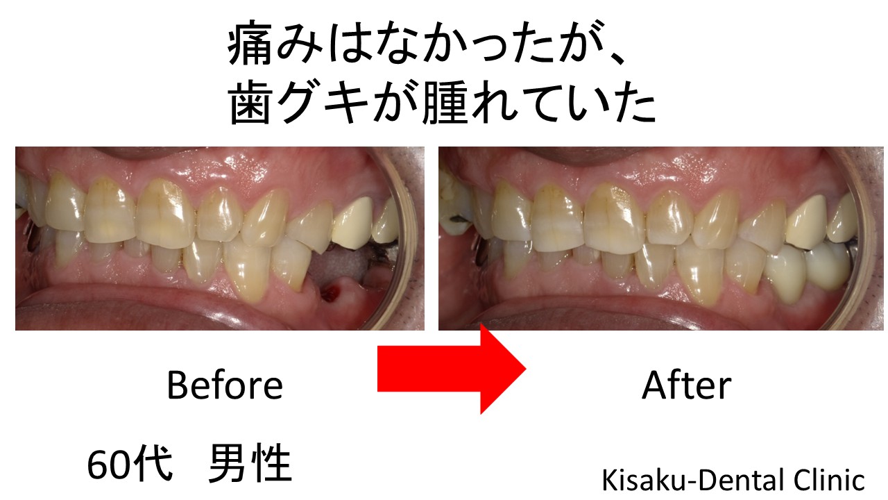 痛みはなかったが、歯根が折れて、歯グキが腫れていた。