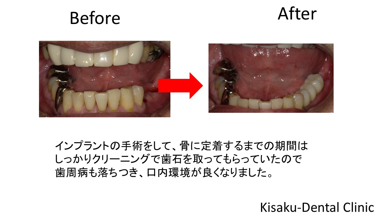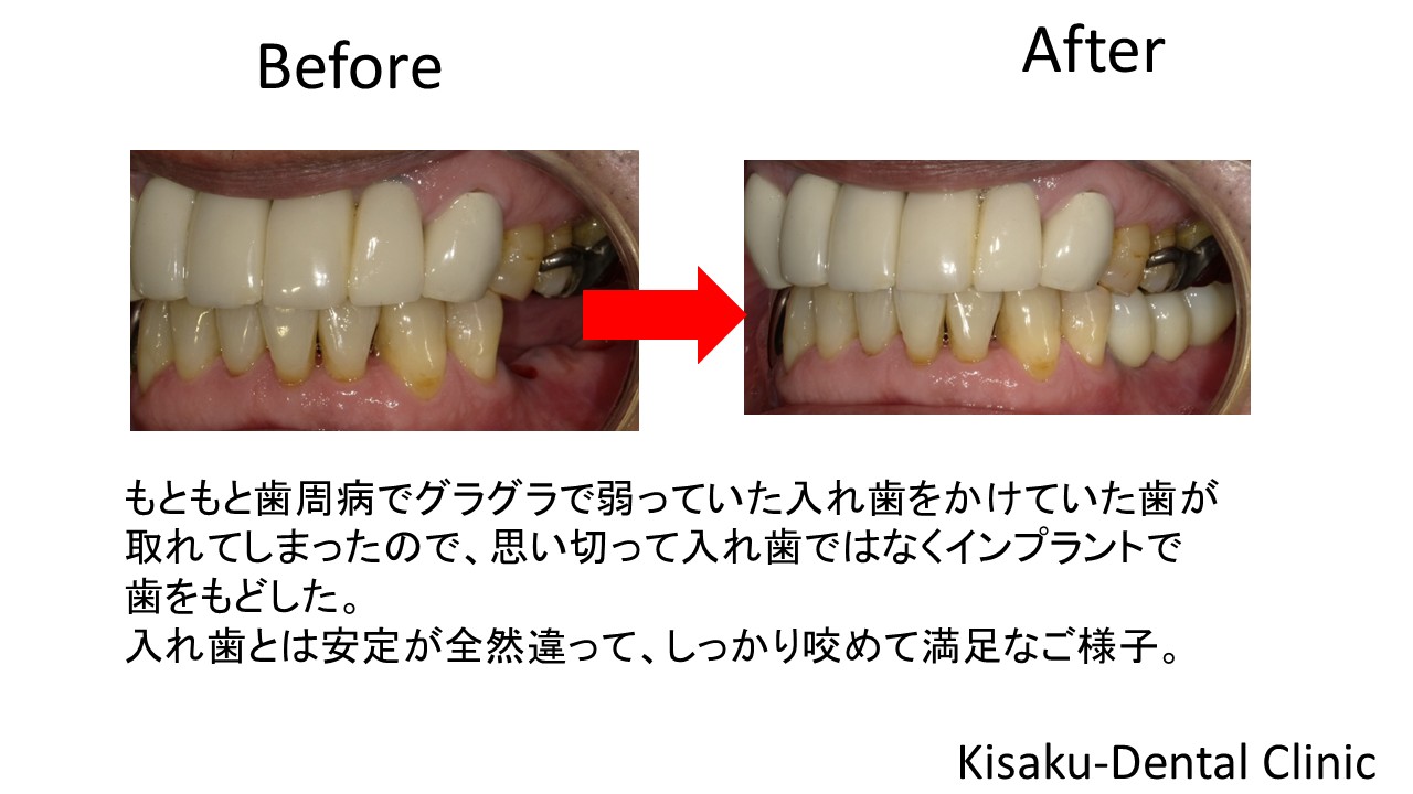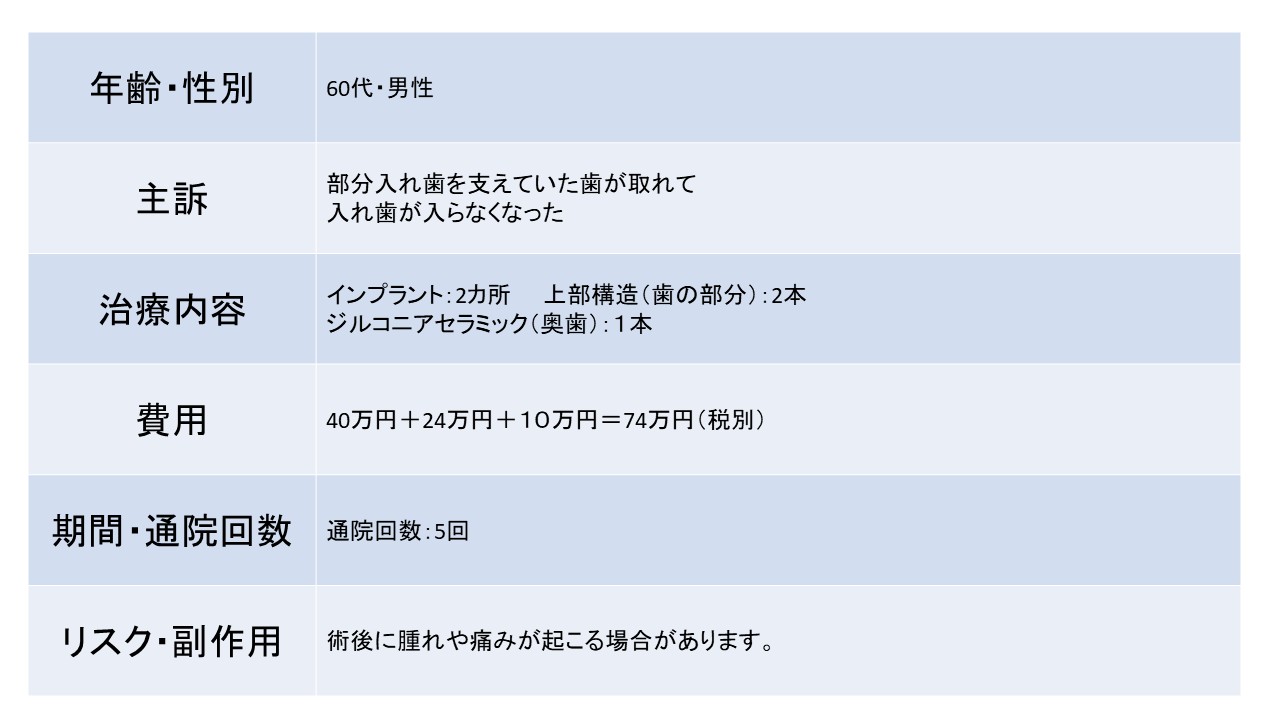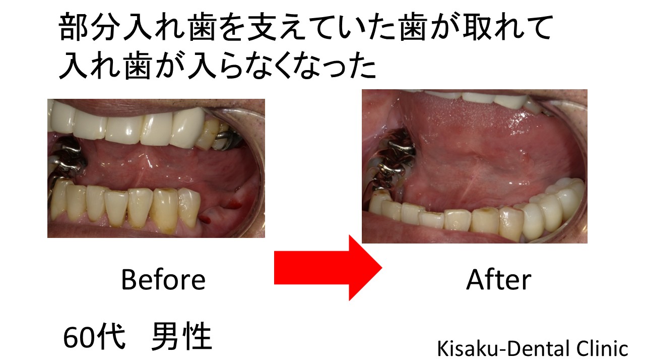 部分入れ歯を支えていた歯が取れて                      入れ歯が入らなくなった                                60代 男性ーインプラントー