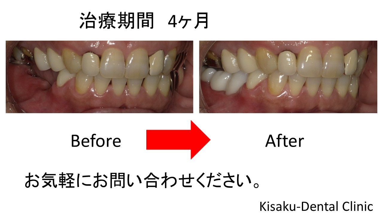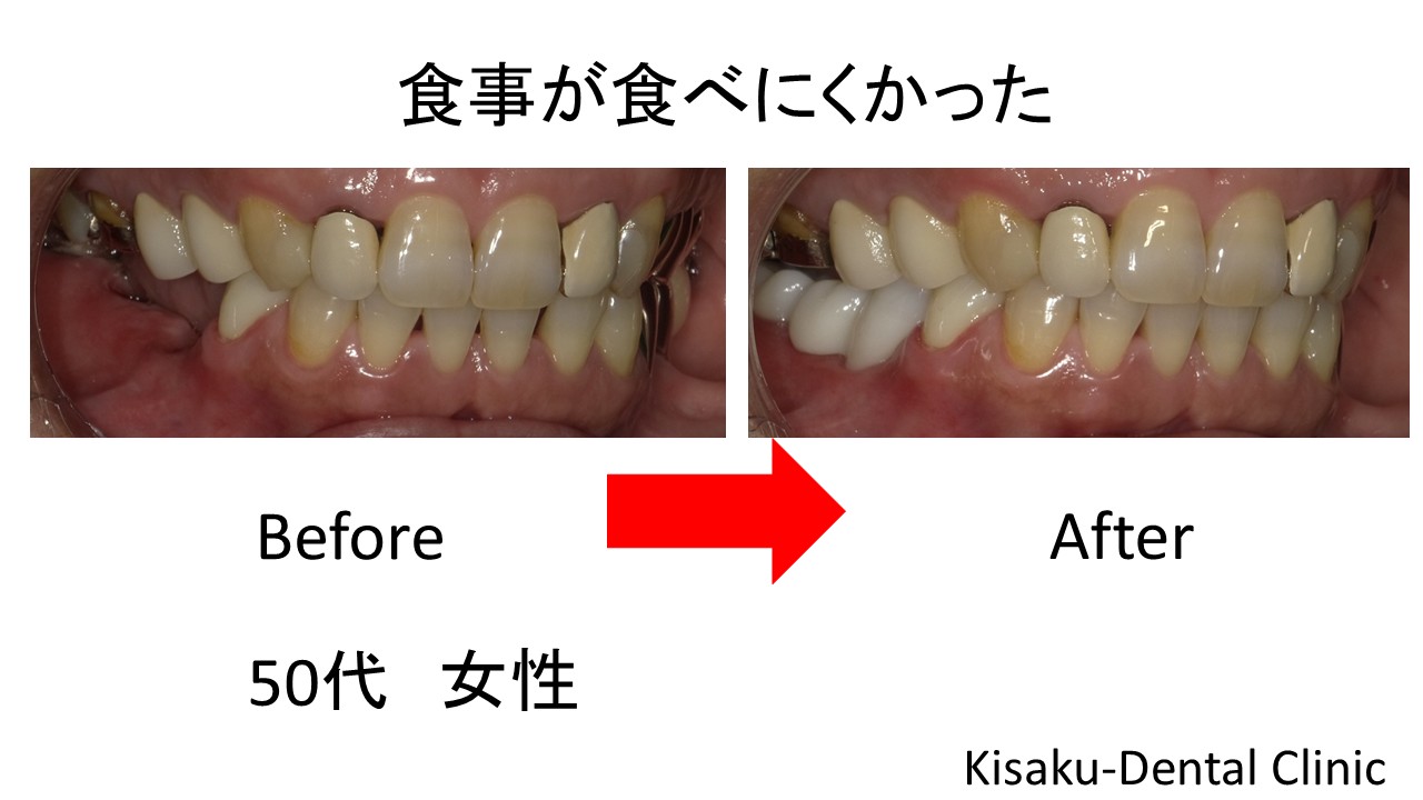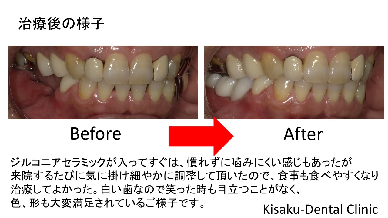 ジルコニアセラミックが入ってすぐは、慣れずに噛みにくい感じもあったが、来院するたびに気に掛け細やかに調整して頂いたので