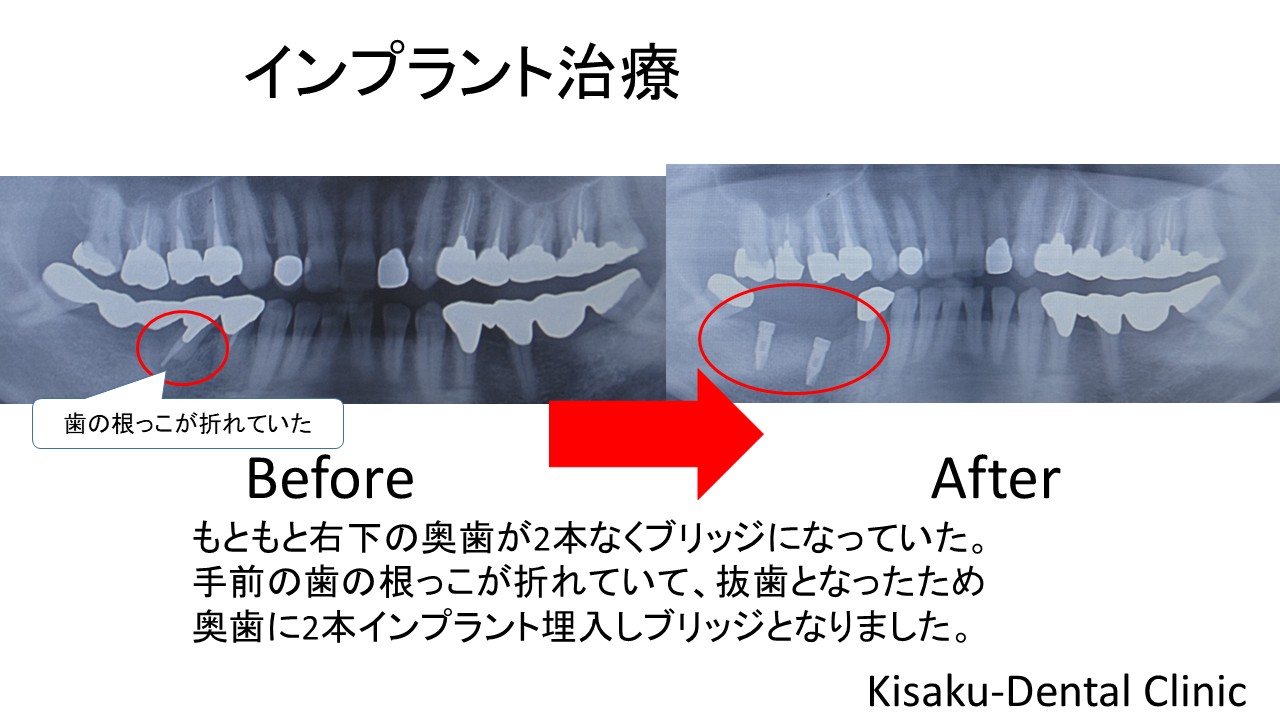 奥歯に2本インプラント埋入しブリッジを新しくしました。