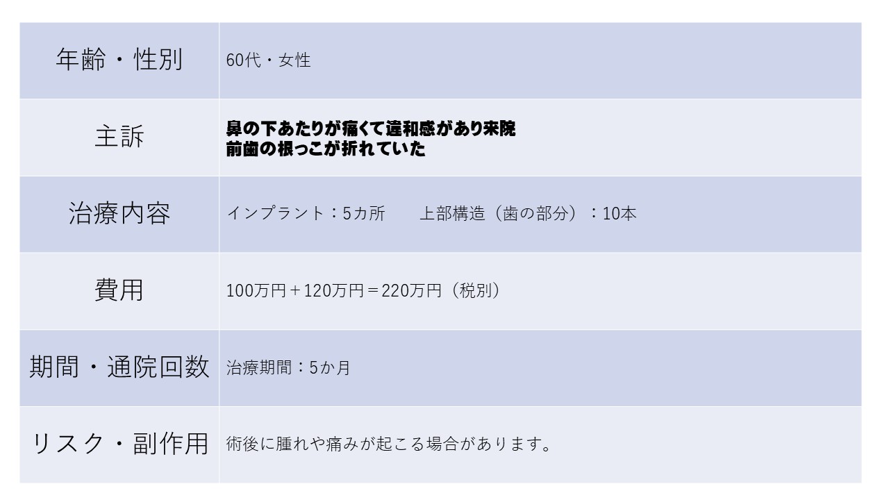 鼻の下あたりが痛くて違和感があり来院 前歯の根っこが折れていた 60代 女性-インプラントー