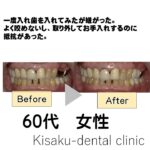 2024-07-20 / 最終更新日 : 2025-11-29 記事編集用 インプラント 奥歯が痛くて咬めない 60代 女性ーインプラントー 歯が割れてしまったため、抜歯をして ジルコニアセラミックのブリッジにした。 今回はブリッジにしたが、他はインプラントが入っている 取り外しの手間がなく、物が入りこむこともないので満足している。 インプラント […]